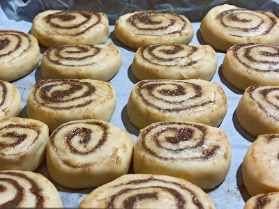 Τοποθετούμε τη γέμιση στο κέντρο της ζύμης και με ένα κουτάλι απλώνουμε παντού στη ζύμη, εκτός από τη μία άκρη. Τυλίγουμε τη ζύμη μας, διπλώνοντας από τη μεγάλη πλευρά του ορθογωνίου μέχρι να δημιουργήσουμε ένα μεγάλο ρολό. Με ένα μαχαίρι κόβουμε τη ζύμη σε ρολάκια, περίπου 2 εκατοστών. Τοποθετούμε σε ταψί με αντικολλητικό χαρτί, να έχουν λίγη απόσταση μεταξύ τους, σκεπάζουμε με μία πετσέτα και τα αφήνουμε να φουσκώσουν για 30 λεπτά. Ψήνουμε σε προθερμασμένο φούρνο στους 180 βαθμούς στον αέρα για περίπου 30 λεπτά. Αφήνουμε να κρυώσουν.